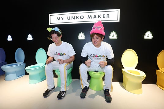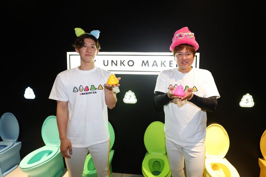 まずは、ずらりとカラフルな便器が並んだ「MY UNKO MAKER」で、津森投手はピンク色、大山投手は黄色のマイうんこを生み出しました。