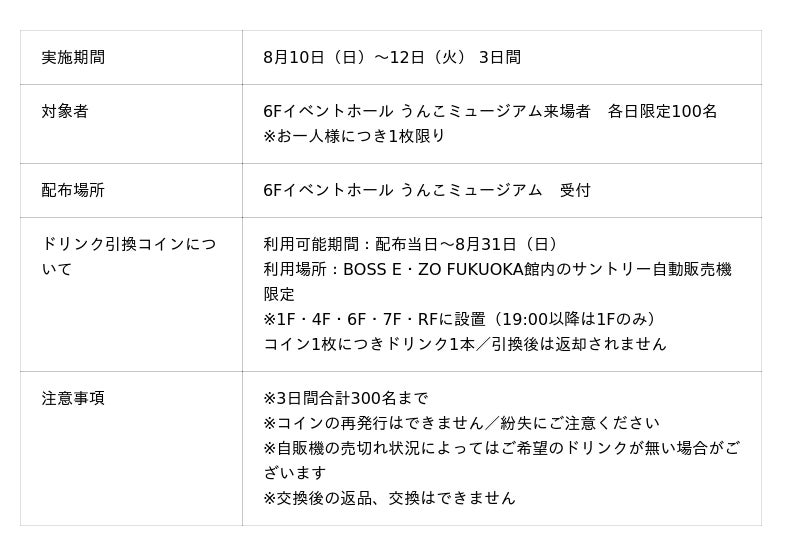 3日間、各日100名様限定で館内のサントリー自動販売機で使用できるドリンク引換コインをプレゼント!