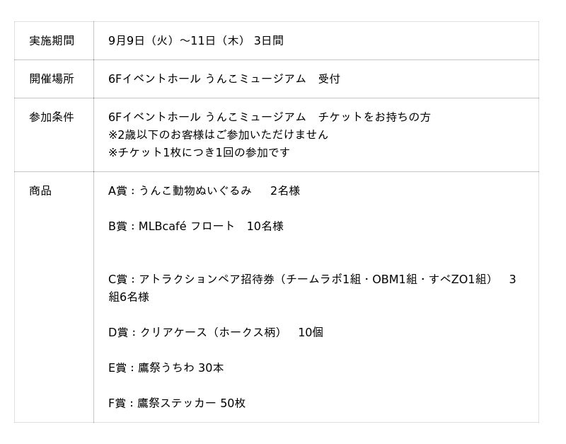 15万人目のお客様には、うんこミュージアムグッズ詰め合わせ・うんこミュージアムコラボグルメお食事券・みずほPayPayドーム福岡で開催の公式戦チケットを贈呈いたしました。