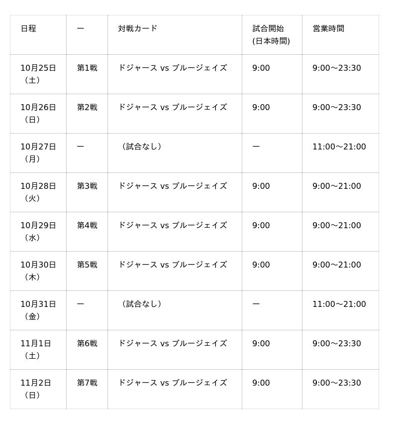 ※第4戦までに優勝が決定した場合は、第5戦以降は通常の営業時間となります。