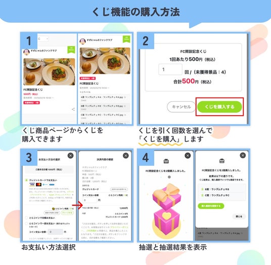 ⇒「くじ機能」は、クリエイティア内でクリエイターが自由に販売できるサービスです。抽選によりユーザーが様々なデジタルコンテンツを獲得できます。