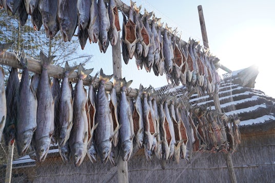 サケやスケソウダラをはじめ、ヤマメやウグイなどの小魚も乾燥させて保存します。