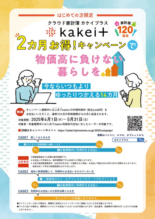 婦人之友社のクラウド家計簿 kakei+(カケイプラス)では、はじめてご利用料のお支払いをいただく方限定の、『物価高に負けない暮らしを 2カ月お得キャンペーン』を実施します。