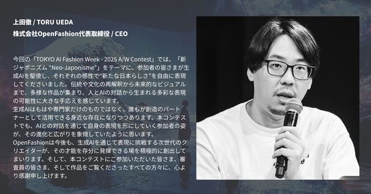 ファッションとAIを始めとした最新テクノロジーをかけ合わせたサービス・プロダクトの開発に取り組む株式会社OpenFashion(本社:東京都港区、代表:上田 徹、以下OpenFashion社)は、生成AIを活用したファッションデザインコンテスト「TOKYO AI Fashion Week - 2025 A/W Contest」の結果を発表します。