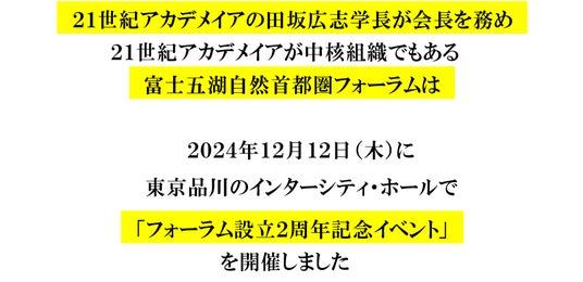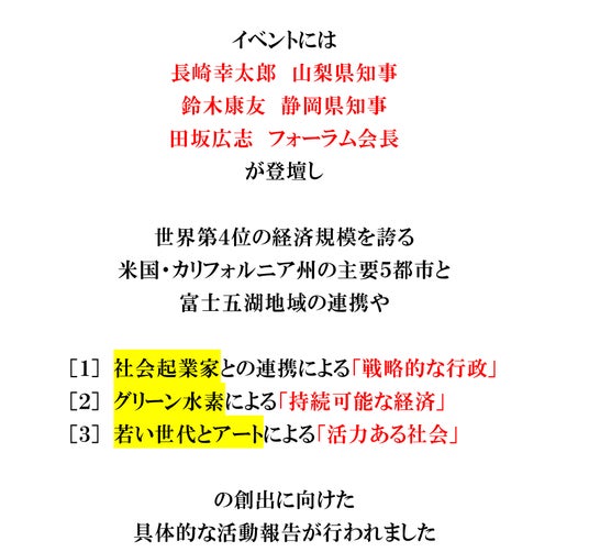 田坂広志学長が会長を務める「富士五湖自然首都圏フォーラム」が「設立2周年記念イベント」を開催。アートと若い世代による活力ある社会の実現を目指し、カリフォルニア州の主要都市との連携を発表
