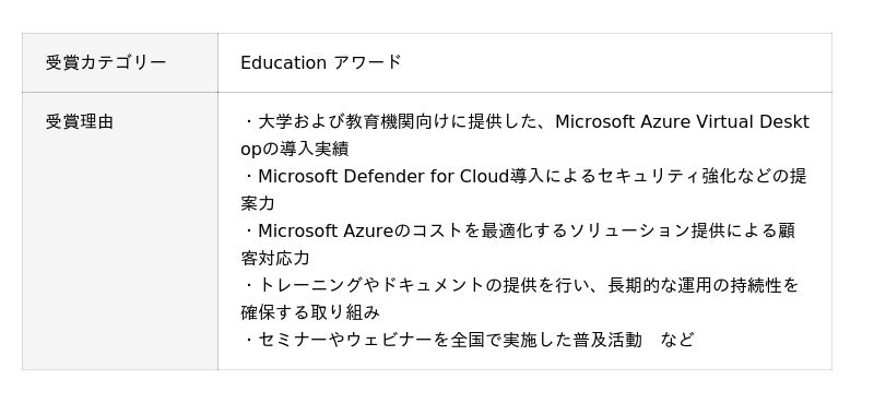 「Education アワード」は、教育業界においてMicrosoftの最新テクノロジーを活用し、優れたサービスや革新的なソリューションを提供したパートナー企業に贈られる賞です。