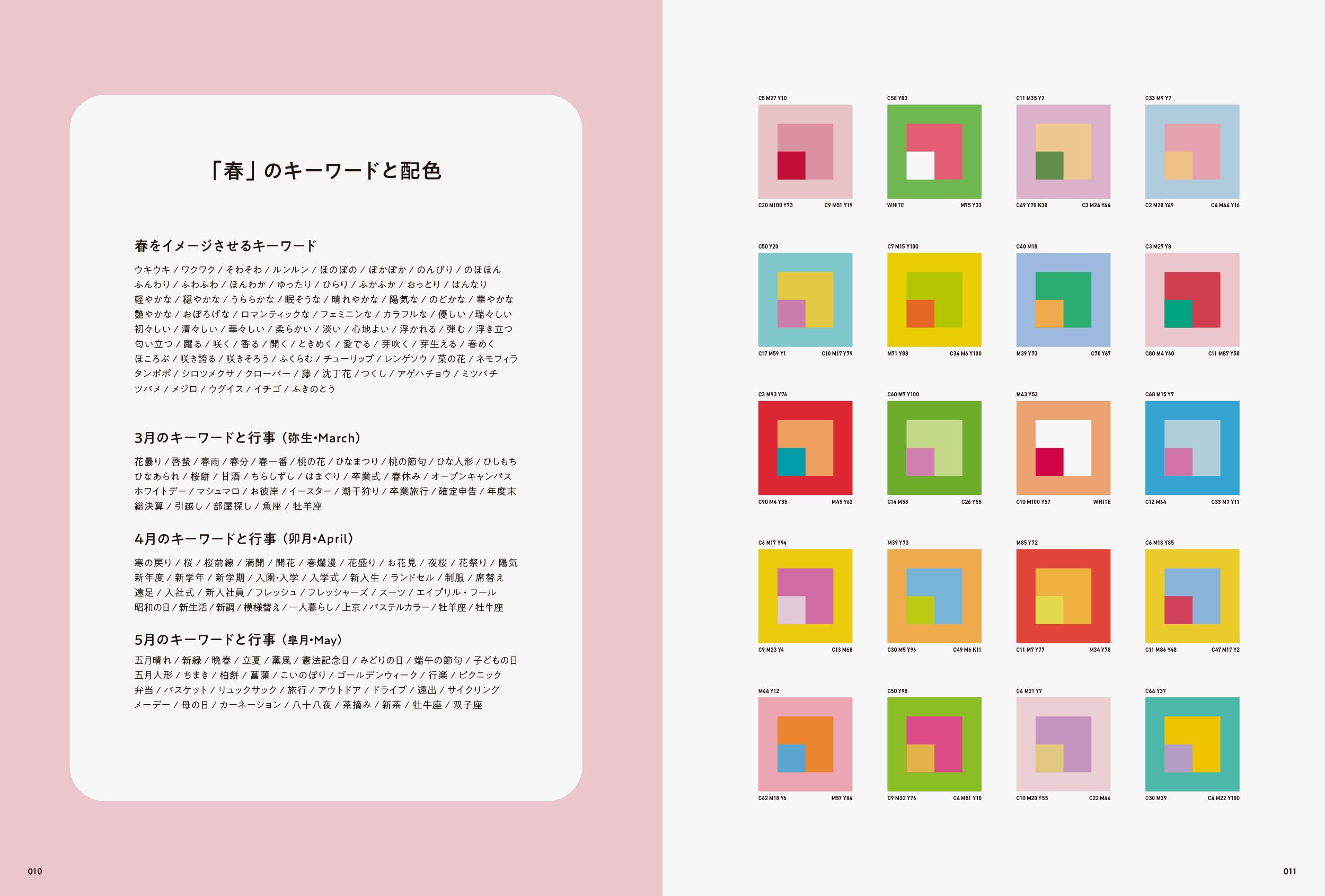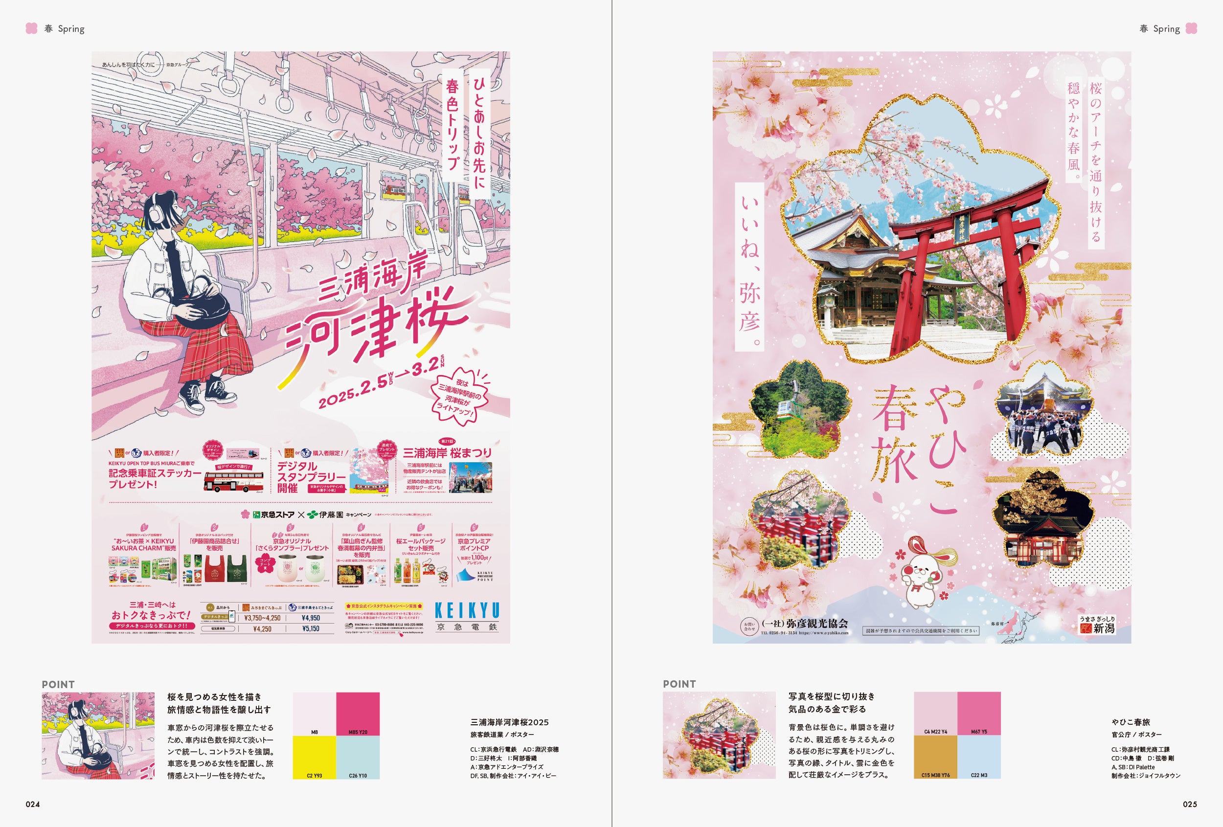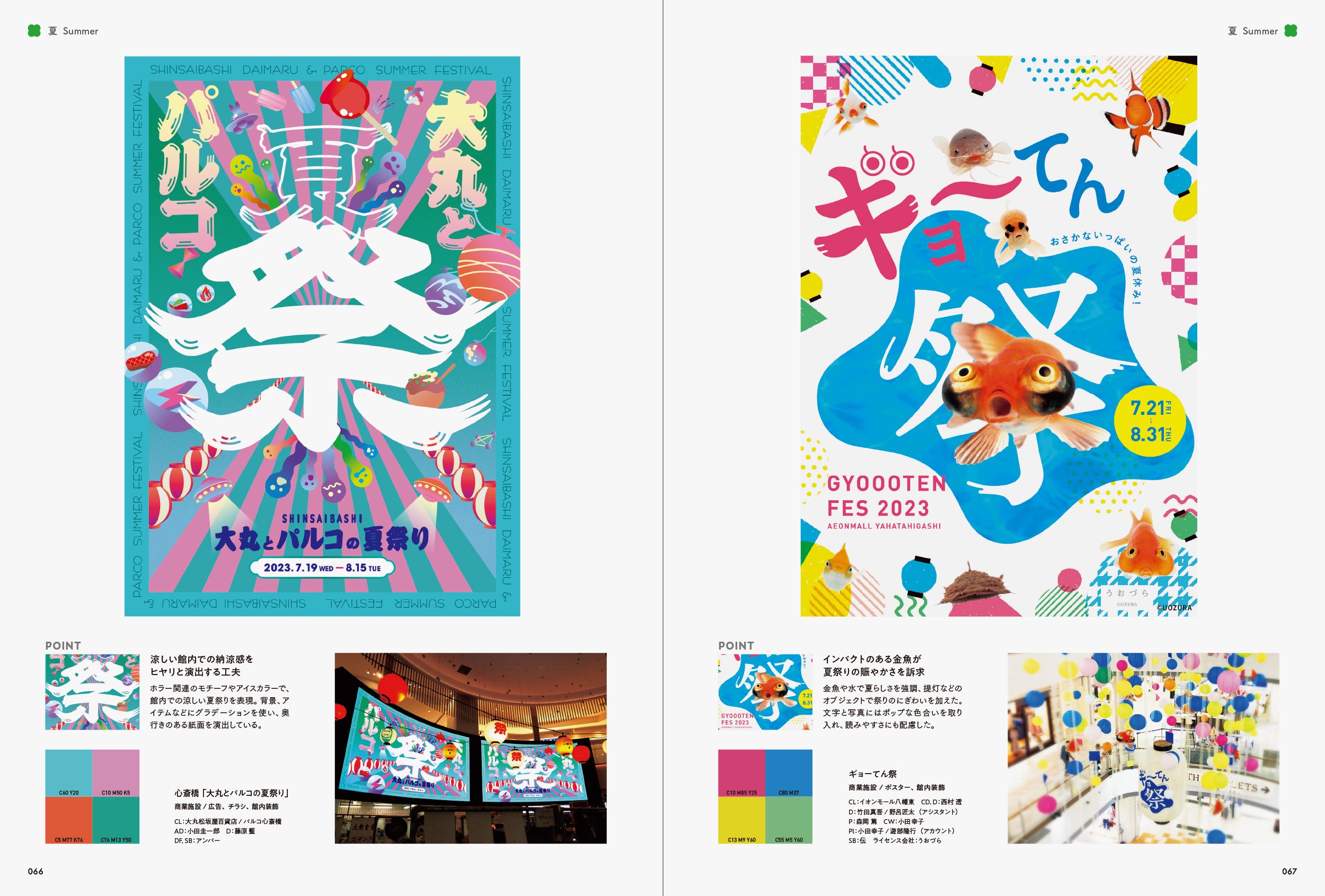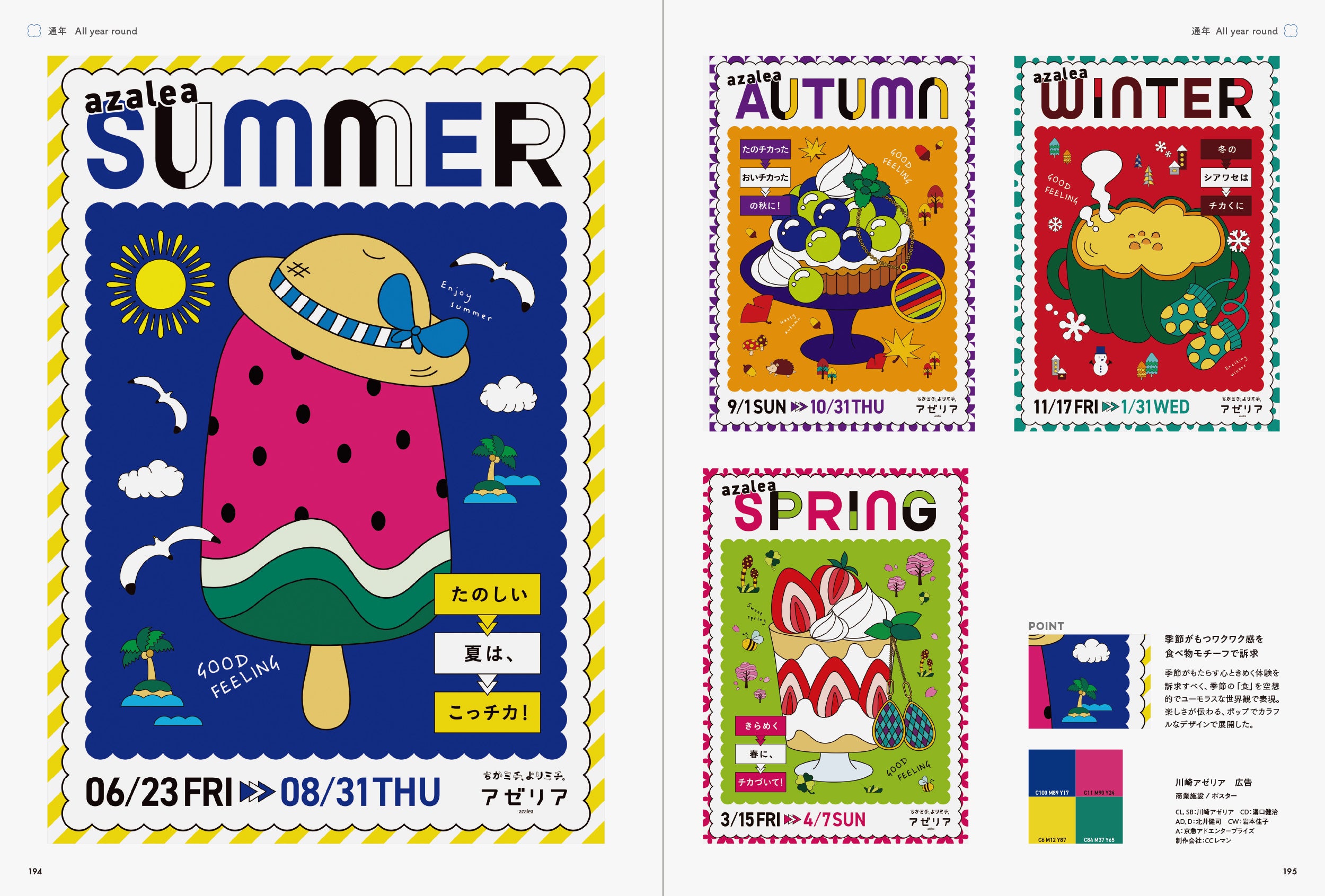 そこで、本書では「季節感」を魅力的に伝えている作品にクローズアップしました。「春」「夏」「秋」「冬」「通年」と、季節ごとに作品を収録しています。また、各章の巻頭ページでは、季節の行事やキーワード、その季節をイメージさせる配色を掲載し、巻末ページでは季節ごとの優れたキャッチコピーを紹介しています。