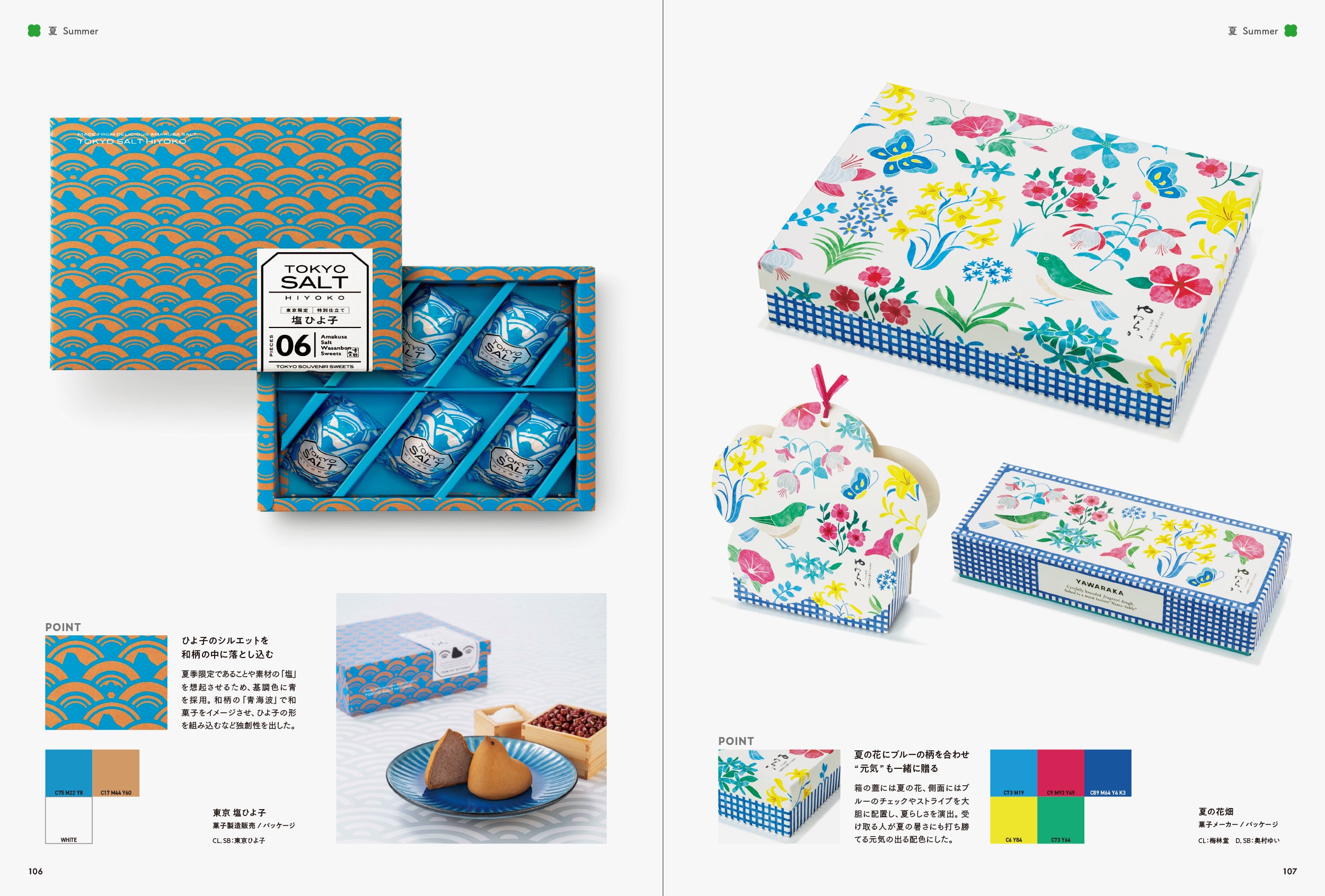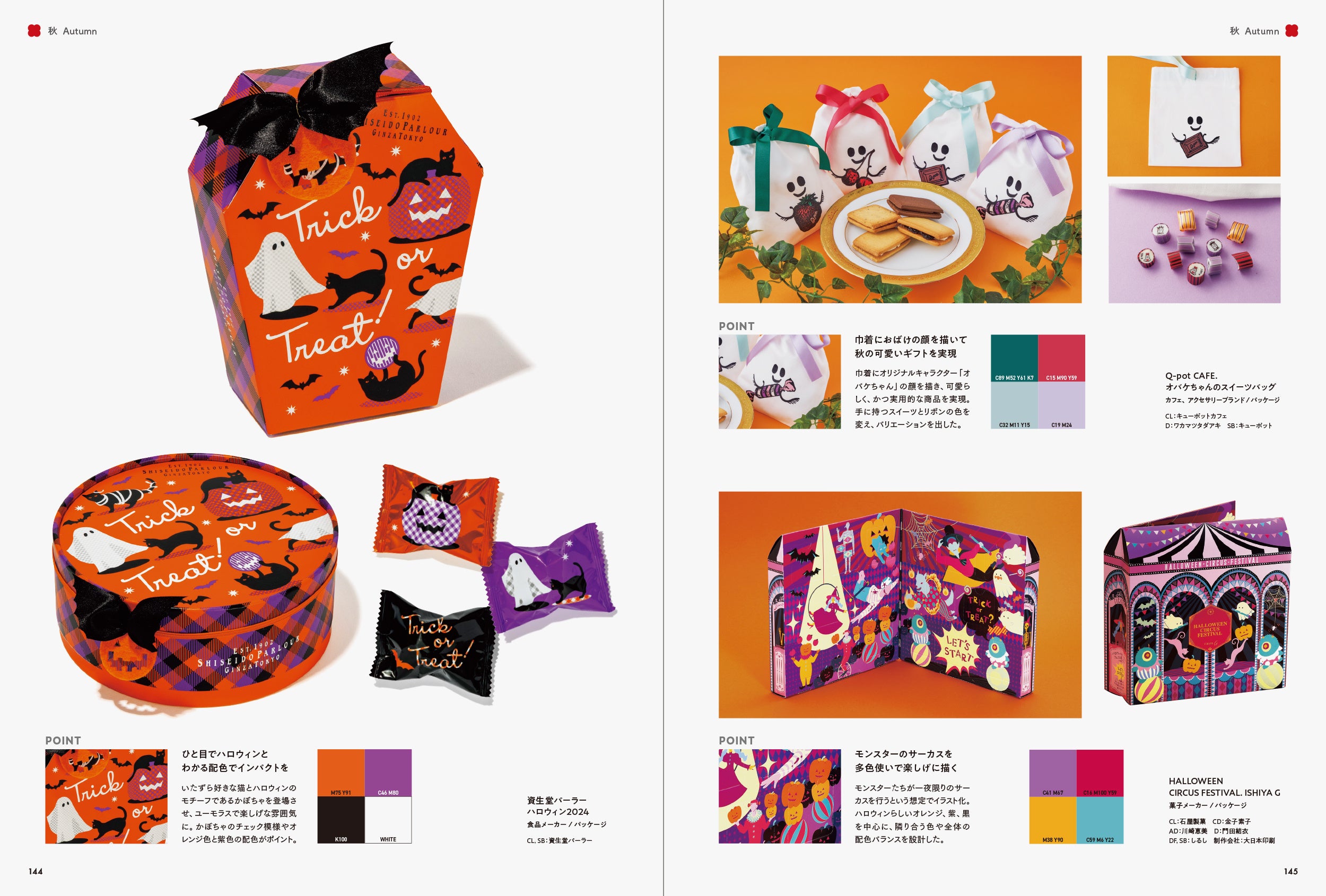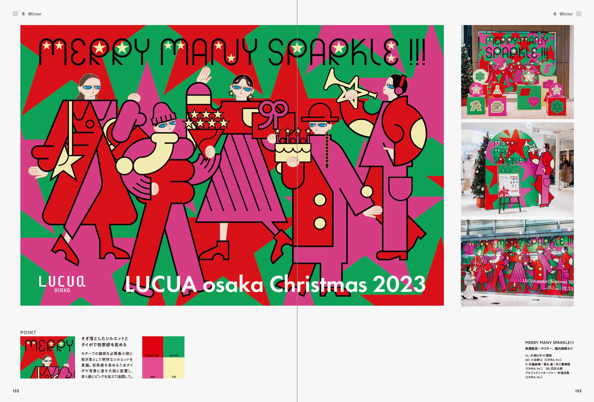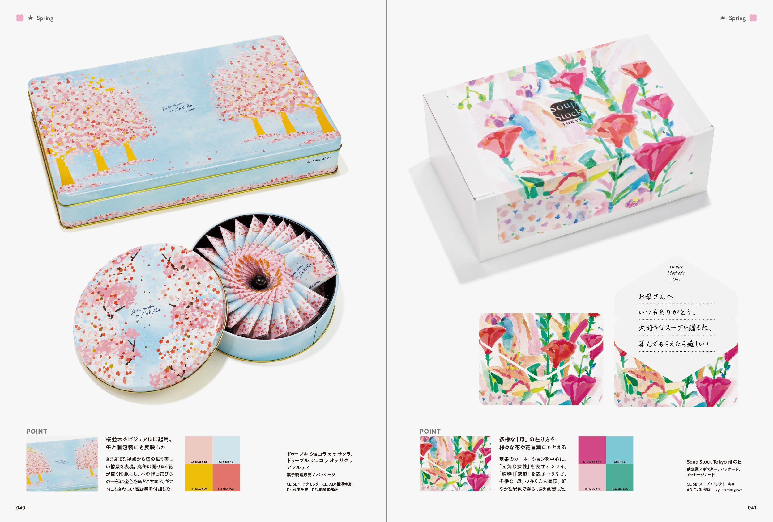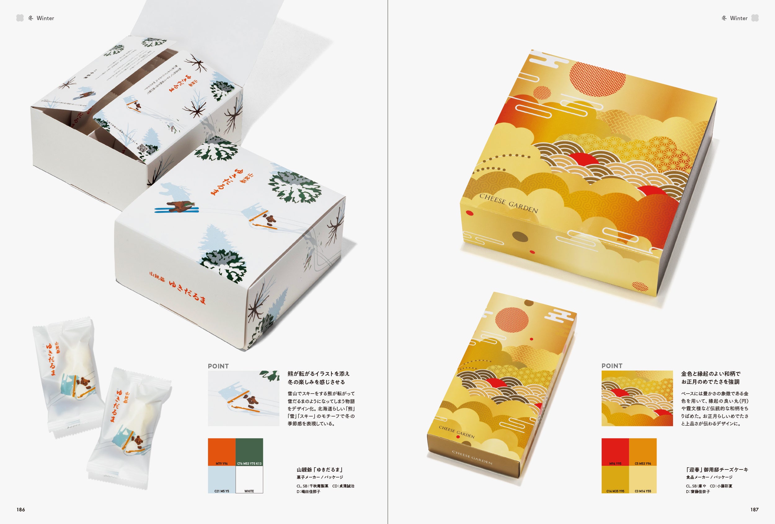 そこで、本書では「季節感」を魅力的に伝えている作品にクローズアップしました。「春」「夏」「秋」「冬」「通年」と、季節ごとに作品を収録しています。また、各章の巻頭ページでは、季節の行事やキーワード、その季節をイメージさせる配色を掲載し、巻末ページでは季節ごとの優れたキャッチコピーを紹介しています。