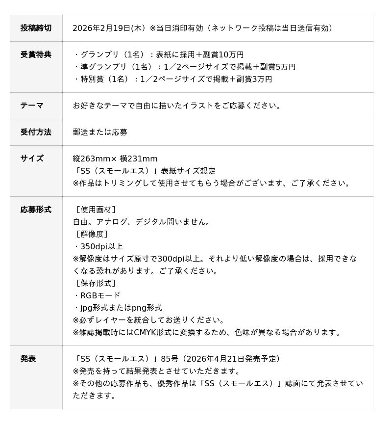 次号の「SS(スモールエス)」よりしばらくの間、表紙イラストを投稿者の皆さんから募集する特別企画を実施いたします!表紙イラストコンテストを募集する絵のテーマは自由。投稿者の中からグランプリを受賞した方のオリジナルイラストが雑誌の表紙に採用されます。