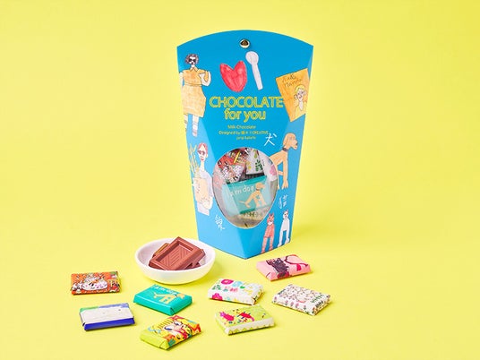 他にも8種類のアートワークが一口チョコのパッケージになった「アートBOX」も今期発売された商品です。ヘーゼルナッツパウダーを練りこんだ人気のミルクチョコㇾ-トがポップで楽し気なブルーのBOXに入っています。こちらのパッケージは筧純爾さんによるアートワーク。