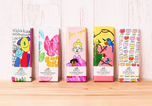 今期販売中の『Artisanチョコレート』と『Artisanコーヒー』もまた、新たな目を惹くポップでキュートな限定アートパッケージを装っています。販売中の5種類のフェアトレードチョコレートは、「嬉々!!CREATIVE」の所属アーティスト、池田ジャスティーヌさん(左端)、山本頼子さん(左から二番目)、筧純爾さん(左から三番目)、水野貴男さん(右から二番目)、森山幸美(右端)さんによるアートワークで、それぞれ味が違います。