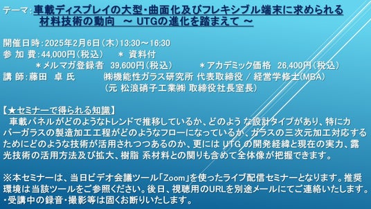 【ライブ配信セミナー】車載ディスプレイの大型・曲面化及びフレキシブル端末に求められる材料技術の動向 ~ UTGの進化を踏まえて ~ 2月6日(木)開催 主催:(株)シーエムシー・リサーチ