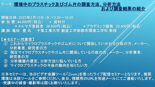 先端技術情報や市場情報を提供している(株)シーエムシー・リサーチ(千代田区神田錦町: https://cmcre.com/ )では、 各種材料・化学品などの市場動向・技術動向のセミナーや書籍発行を行っておりますが、 このたび「環境中のプラスチック及びゴム片の調査方法、分析方法および調査結果の紹介」と題するセミナーを、 講師に亀田 豊 氏 (千葉工業大学 創造工学部都市環境工学科 教授)をお迎えし、2025年2月12日(水)13:30より、 ZOOMを利用したライブ配信で開催いたします。 受講料は、 一般:44,000円(税込)、 弊社メルマガ会員:39,600円(税込)、 アカデミック価格は26,400円(税込)となっております(資料付)。