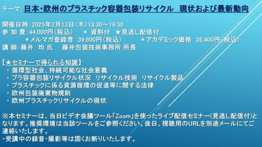 先端技術情報や市場情報を提供している(株)シーエムシー・リサーチ(千代田区神田錦町: https://cmcre.com/ )では、 各種材料・化学品などの市場動向・技術動向のセミナーや書籍発行を行っておりますが、 このたび「日本・欧州のプラスチック容器包装リサイクル 現状および最新動向」と題するセミナーを、 講師に藤井 均 氏 (藤井包装技術事務所 所長)をお迎えし、2025年2月13日(木)13:30より、 ZOOMを利用したライブ配信(見逃し配信付き)で開催いたします。 受講料は、 一般:44,000円(税込)、 弊社メルマガ会員:39,600円(税込)、 アカデミック価格は26,400円(税込)となっております(資料付)。