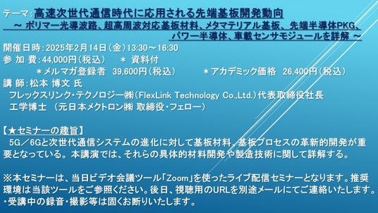 先端技術情報や市場情報を提供している(株)シーエムシー・リサーチ(千代田区神田錦町: https://cmcre.com/ )では、 各種材料・化学品などの市場動向・技術動向のセミナーや書籍発行を行っておりますが、 このたび「高速次世代通信時代に応用される先端基板開発動向 ~ ポリマー光導波路、超高周波対応基板材料、メタマテリアル基板、 先端半導体PKG、パワー半導体、車載センサモジュールを詳解 ~」と題するセミナーを、 講師に松本 博文 氏 (フレックスリンク・テクノロジー(株)(FlexLink Technology Co.,Ltd.)代表取締役社長 工学博士 (元日本メクトロン(株) 取締役・フェロー))をお迎えし、2025年2月14日(金)13:30より、 ZOOMを利用したライブ配信で開催いたします。 受講料は、 一般:44,000円(税込)、 弊社メルマガ会員:39,600円(税込)、 アカデミック価格は26,400円(税込)となっております(資料付)。