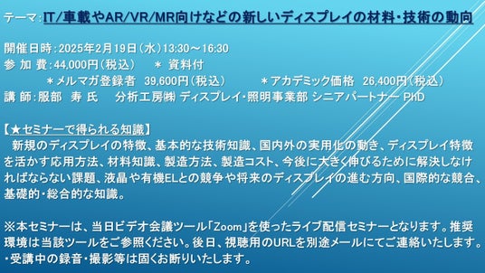 先端技術情報や市場情報を提供している(株)シーエムシー・リサーチ(千代田区神田錦町: https://cmcre.com/ )では、 各種材料・化学品などの市場動向・技術動向のセミナーや書籍発行を行っておりますが、 このたび「IT/車載やAR/VR/MR向けなどの新しいディスプレイの材料・技術の動向」と題するセミナーを、 講師に服部 寿 氏 (分析工房(株) ディスプレイ・照明事業部 シニアパートナー PhD)をお迎えし、2025年2月19日(水)13:30より、 ZOOMを利用したライブ配信で開催いたします。 受講料は、 一般:44,000円(税込)、 弊社メルマガ会員:39,600円(税込)、 アカデミック価格は26,400円(税込)となっております(資料付)。