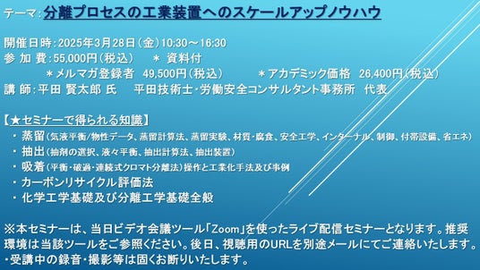 先端技術情報や市場情報を提供している(株)シーエムシー・リサーチ(千代田区神田錦町: https://cmcre.com/ )では、 各種材料・化学品などの市場動向・技術動向のセミナーや書籍発行を行っておりますが、 このたび「分離プロセスの工業装置へのスケールアップノウハウ~ フリーソフト化学プロセスシミュレータ使用法伝授 ~」と題するセミナーを、 講師に平田 賢太郎 氏(平田技術士・労働安全コンサルタント事務所 代表)をお迎えし、2025年3月28日(金)10:30より、 ZOOMを利用したライブ配信で開催いたします。 受講料は、 一般:55,000円(税込)、 弊社メルマガ会員:49,500円(税込)、 アカデミック価格は26,400円(税込)となっております(資料付)。