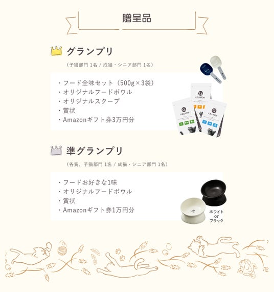 グランプリ受賞者にはGRANDSプレミアムキャットフード全味セット(1.5kg分)と非売品オリジナルグッズ、Amazonギフト券3万円分をプレゼント!