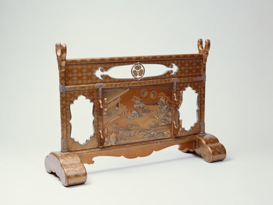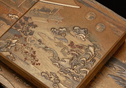 「初音の調度」は千代姫の婚礼調度という明確な目的を持って製作されました。そのため、寛永14年(1637)に幕府から蒔絵師・幸阿弥長重(こうあみ ちょうじゅう)に製作の命が下り、2年後の寛永16年(1639)に完成したことが記録として残されています。幸阿弥家は蒔絵師の家系で、なかでも長重は天皇家や大名家の道具を多数製作し、その名声を高めた人物です。幕府の命を受けた長重はプロデューサーとして製作の指揮にあたり、多くの職人を束ねながら驚異的なスピードで婚礼調度を完成まで導きました。当時200件から300件は作られたとされる調度類は現在70件を残すのみですが、他の大名家の婚礼調度のほとんどが散逸されているなか、70件という数は他に類を見ない奇跡ともいうべき現存数となっています。