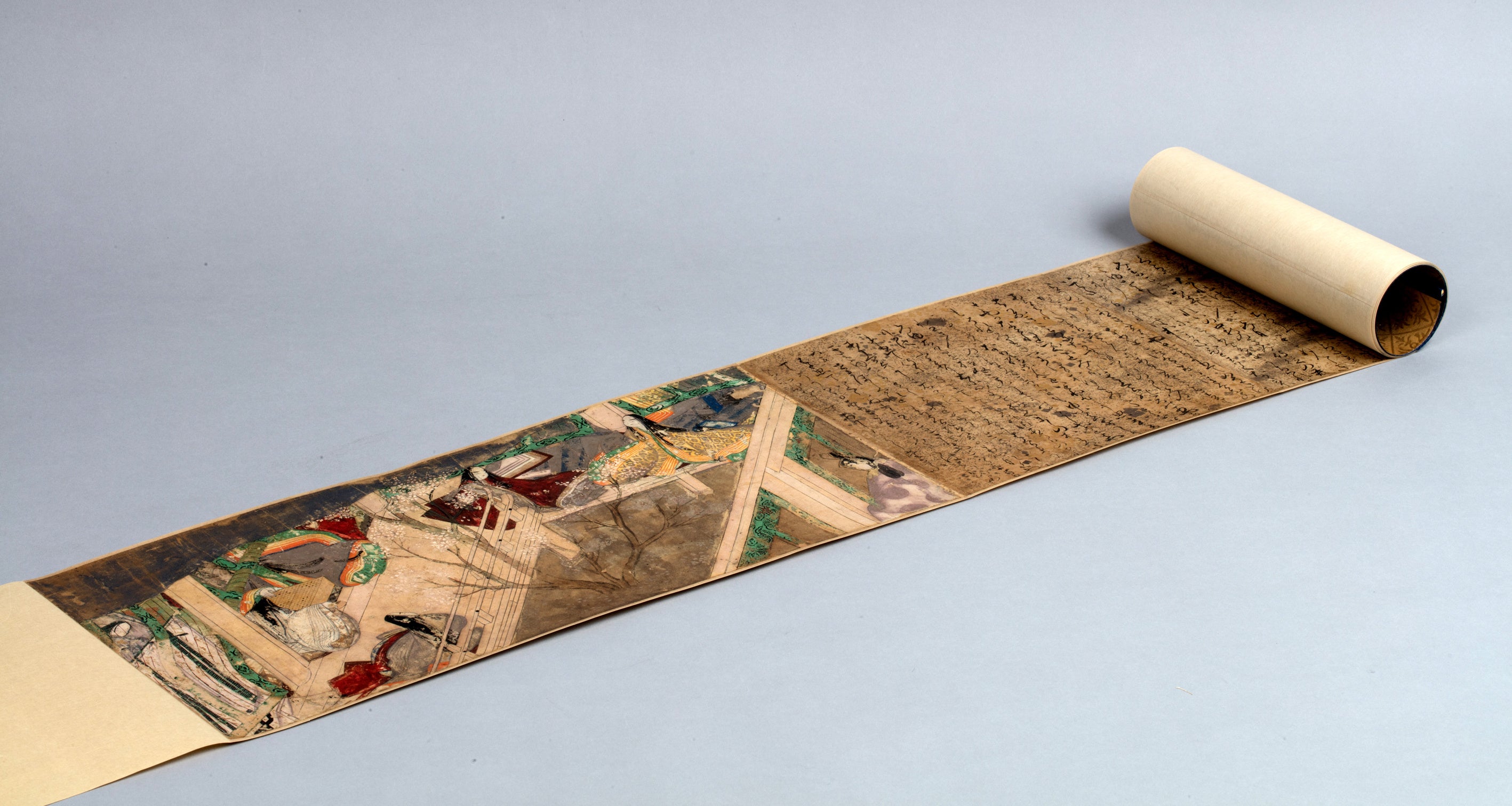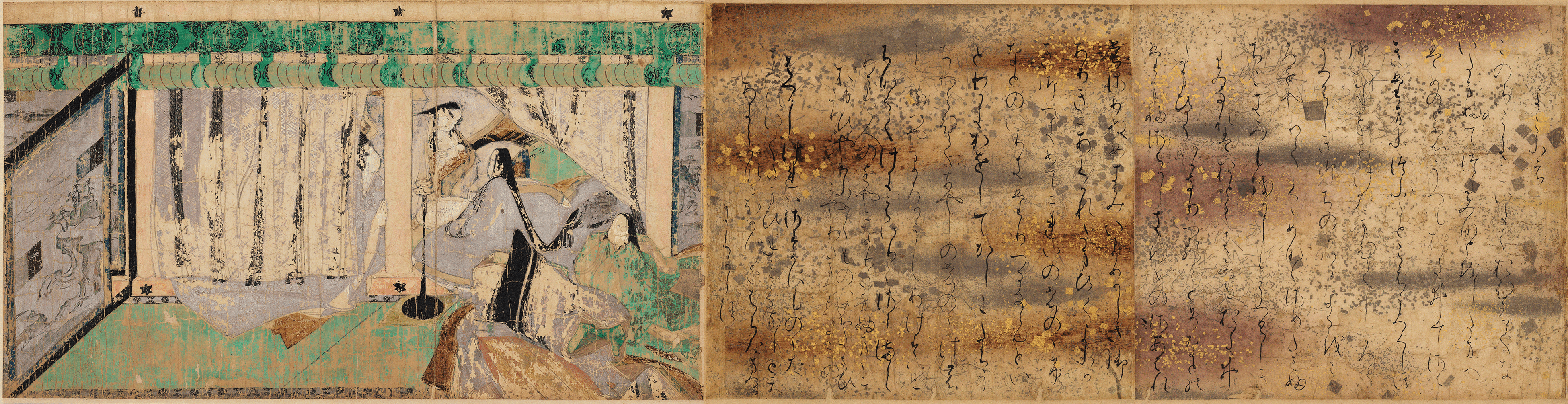 詞書の後ろに、その内容に呼応する絵をつないだ絵巻。右から左へ見る。 国宝「源氏物語絵巻」竹河(二)徳川美術館蔵