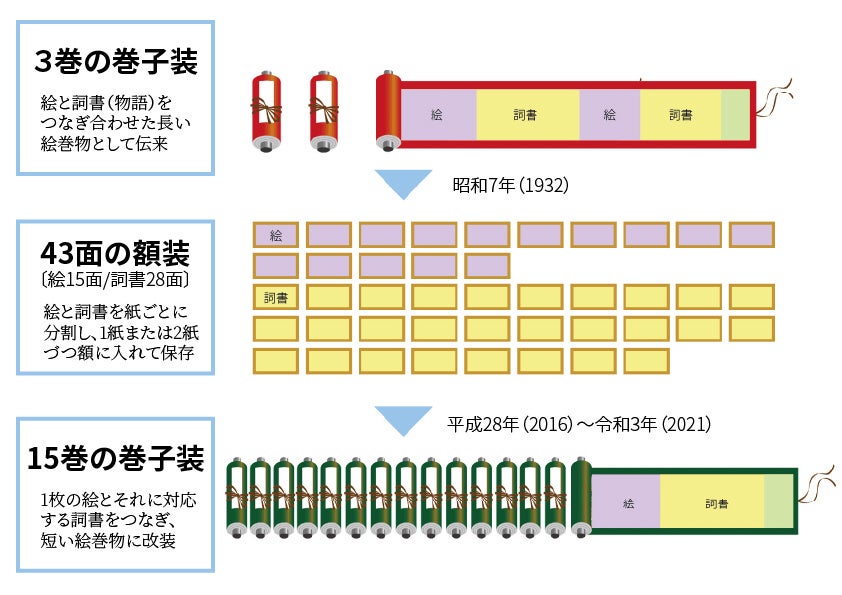 それからおよそ80年を経て、徳川本の絵15図には、本紙の折れや亀裂、絵の具の剥落・剝離、料紙の劣化などの損傷が見られるようになったため、平成24年から4年にわたり、詞書の一部とともに修理が行われました。当初は修理後の本紙を従来どおり台紙貼とし、桐箱に収める予定でしたが、桐箱の収縮によって台紙に反りが生じ、常に本紙に張力がかかることで剥落や亀裂を誘発していたことが判明しました。このため、保存の安全性と展示方法の両面から検討が重ねられ、絵を一段ごとに分けて再び巻子装に戻す現状変更が文化庁文化審議会で認められ、平成28年から4年間をかけて、詞書の修理および巻子装への改装が実施されました。