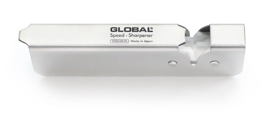 3) GLOBALスピードシャープナーGLOBALの両刃包丁用の簡易シャープナーです。包丁の切れ味が鈍り始めたら、軽く手前に6~10回引いて頂く事で、切れ味を一時的に蘇らせることが出来ます。