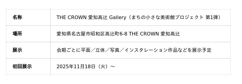 - 『THE CROWN 愛知高辻 Gallery』始動:ショールームの一角を常設ギャラリー化。日常の動線にアートをひらく新拠点へ。