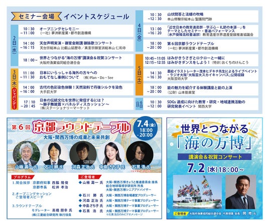 メイン会場の大阪・関西万博会場では、大催事場の「EXPO メッセ」にて、日本のナショナルデーの7月3日(木)のジャパンデーを含む7月2日(水)~7月6日(日)、54団体による106ブースの出展と芸術や学術セミナー等の催事を行います。