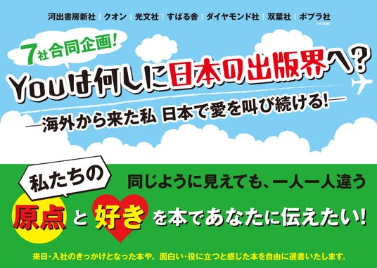 株式会社河出書房新社、株式会社クオン、株式会社光文社、株式会社すばる舎、株式会社ダイヤモンド社、株式会社双葉社、株式会社ポプラ社の出版社7社は、各社で働く海外出身の社員が企画、選書した合同フェア「Youは何しに日本の出版界へ? 海外から来た私、日本で愛を叫び続ける!」を全国書店へ案内、注文を募り、2026年3月下旬より順次開催となっています。