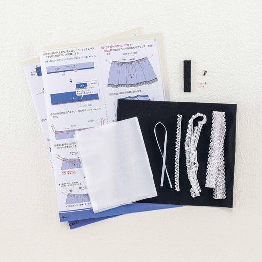 オビツ11ドールにフィットするお洋服は、はっと目を奪われるほど繊細で、まるで本物のような雰囲気を醸し出しながらも、簡単な作業で本格的に仕上がる工夫が詰まっています。1セットでクラシカルで品のあるワンピースとエプロン、ヘッドドレスの3点が作れます。