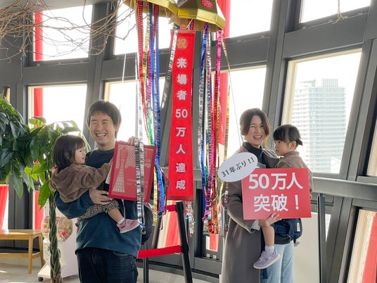 フェリシモが屋上デッキや展望フロア、低層1階エントランスやチケット売り場を運営する「神戸ポートタワー」が1月24日(金)、来場者数50万人を突破しました。2024年4月26日にリニューアルオープンしてわずか9ヵ月のスピード到達となり、午後10時35分ごろに館内でアナウンスされると展望フロアは祝福ムードに包まれました。記念すべき50万人目のお客さまは石川県金沢市からご来場の井口 周人(いのくち しゅうと)さん。ご家族の妻の幸(ゆき)さん、長女の結月(ゆづき)さん、次女の凪彩(なぎさ)さんといっしょに「おとといが長女の誕生日で、そのための旅行として神戸に来ました。まさか50万人という記念すべきタイミングで来れるとは思っていなかったので、とてもうれしいです」としあわせにあふれるご感想をくださいました。短期間での50万人突破にあたり、記念盾や神戸ポートタワーグッズなどを贈呈したフェリシモ神戸ポートタワー事業本部タワーマネージャーの大島彰は「4月のリニューアルオープン後、神戸市内をはじめ全国、あるいは海外から多くのお客さまにご来場いただき、あっという間に50万人に到達し感謝しかありません。震災後30年の節目の年に達成できたことも感慨深いです。引き続き何度でも来ていただけるようなおもてなしを用意してお待ちしています。」とコメントしています。