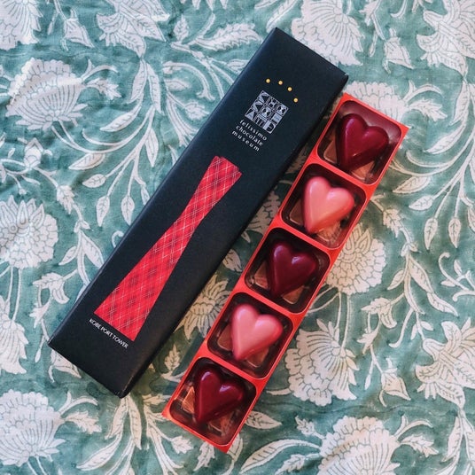 〈神戸ポートタワーチェック〉柄のパッケージに入った5粒(2種)のつややかなハートのボンボンチョコレートは、上質な素材使いが光るフルーティーでみずみずしい味わいの「フェリシモ チョコレート ミュージアム」のオリジナルアソートです。赤いハートは甘酸っぱいパッションフルーツのジュレとガナッシュをミルクチョコレートでまろやかに、ピンクのハートは甘酸っぱいフランボワーズのジュレとフランボワーズのガナッシュをミルクチョコレートの中に閉じ込め、やさしい味わいに仕上げています。スイーツやチョコレート好きな人へのバレンタインプレゼントやパーティーの手土産にも。