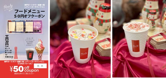 神戸ポートタワー「Ready go round mini[レディーゴーラウンドミニ]」で販売中のソフトクリーム、アイスコーヒーや下の冬メニューなどが50円割引価格で購入できます。