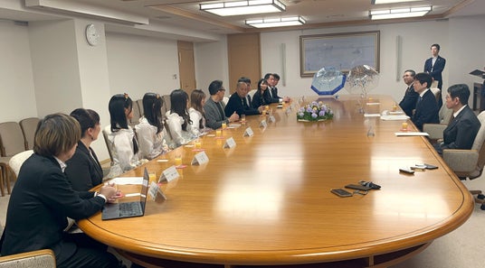 「青森・神戸共創ビジネス推進事業」から誕生した新商品の発売に際し、奥田副知事へフェリシモ新事業開発本部本部長 小池弘之ほか2名と北洋硝子の壁屋知則氏ほか1名、りんご娘、リンゴミュージックの樋川新一氏、リンゴアメ株式会社の下田翼氏が表敬訪問を行いました。奥田副知事からは、「青森の誇る伝統工芸をモチーフにした商品や楽曲が発売されることを本当に嬉しく思う。全国で商品も曲も大ヒットして、ビジネスの発展につながっていけば」とコメントをいただきました。