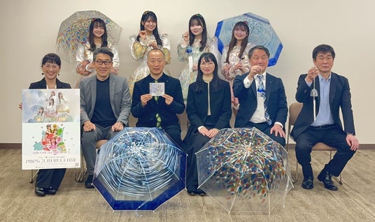 フェリシモが展開するユーモア雑貨ブランド「YOU+MORE!」は日本初の取り組みとして、青森県の伝統工芸品のガラス製品「津軽びいどろ」の風鈴をモチーフにした透明な傘「ガラスの音色が降りそそぐ 青森の伝統工芸 津軽びいどろの風鈴傘」のウェブ予約販売を3月19日より開始しています。同日には青森県庁でフェリシモ、北洋硝子、リンゴミュージック3社が登壇する合同記者発表を青森県庁で開催し、伝統工芸の魅力をデザイン透明傘や音楽、衣装を通じて全国へ伝え、未来へつなぐ意気込みを語りました。