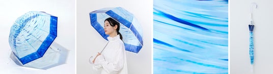 青森の色彩豊かな海と空の景色をブルーで表現した「日本海」というデザインの風鈴を傘に再現。広げると、深いブルーとらせん状の美しい表情に引き込まれます。