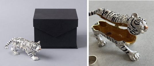 中世ヨーロッパの貴婦人たちが使用していた贅沢な装飾のピルケースを模した、小さくて愛らしいジュエリーボックスです。アンティーク風のたたずまいで、1点ずつ職人さんの手作業で仕上げられています。エナメルの光沢感やラインストーンのきらめきが美しく、ずしりと持ち重りする冷たい手ざわりも本格的です。デザインは〈EGG〉、〈STRAWBERRY〉、〈HEART〉、〈HORSE〉、〈RABBIT〉、〈TIGER〉の6種類。容量は小さめなので、オブジェとして楽しむのもおすすめです。お部屋に飾れば貴婦人気分を楽しめます。