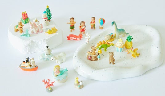 職人さんの手塗りによる絵付けが、あたたかい雰囲気のミニチュアフィギュアです。別世界の主人公たちのほっこりやさしい表情に癒やされます。デザインは〈恐竜時代〉、〈ラッキーモチーフ〉、〈人魚の国〉、〈ありがとうの気持ち〉、〈森の学校〉、〈サファリ〉、〈リラックスタイム〉、〈ポーラー〉、〈クリスマス気分〉、〈ハワイアン〉の全10種類です。テーマに沿って選ばれた4つが1セットになっています。それぞれで飾ったり、自由に組み合わせたり、いろいろな楽しみ方ができます。