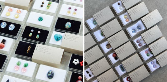 主にドイツの倉庫で発見されたガラス製の「ヴィンテージカボション」のコレクション。製造当時の紙に包まれたまま開封されていない、正真正銘のデッドストックから、専用ケースに入れてお届けします。ひと粒ひと粒趣向を凝らした多種多様な輝きのデザインに、職人技を感じます。