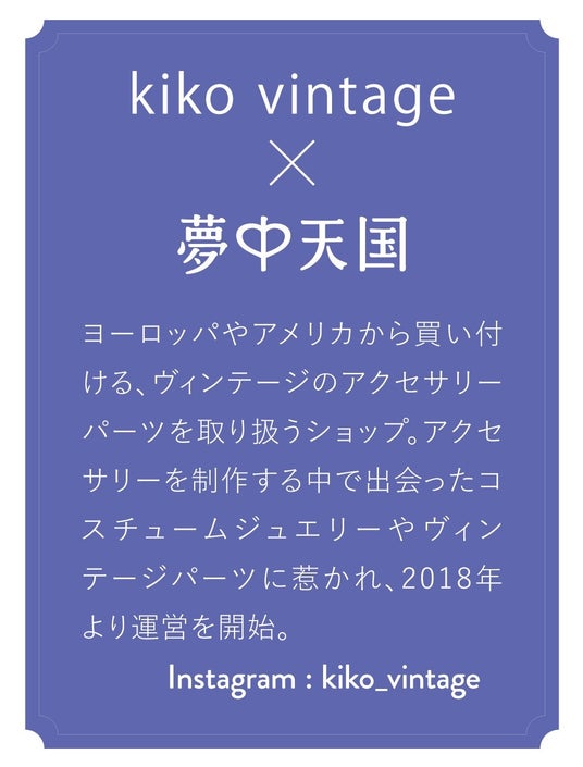 日本の伝統技術で製造された後、海外に輸出された〈ジャパンヴィンテージ〉や裏面に金属箔が貼られた光輝く〈フォイル〉など、多種多様なデザインが楽しめます。箱に入って届くので、そのまま飾るのも◎。背面が平らなので、ピアスやリングなど、接着剤で手軽にアクセサリーが作れます。ヴィンテージのアクセサリーパーツを取り扱う「kiko vintage」と夢中天国のコラボ商品です。