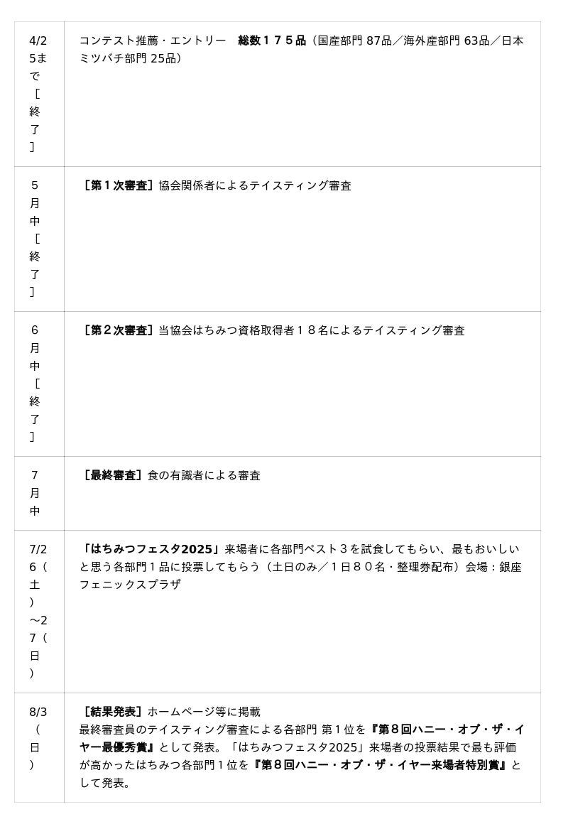 ベスト3が決定!美味しいはちみつコンテスト「第8回ハニー・オブ・ザ・イヤー」2025年 ~ 最優秀賞・来場者特別賞の発表は8月3日に発表