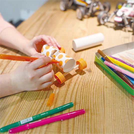 トイレットペーパーの芯やペットボトルのキャップで世界にひとつだけの車をつくったり、本格的なラジコンを走らせたり、子ども免許証をつくったり?!車のたのしいがいっぱい!