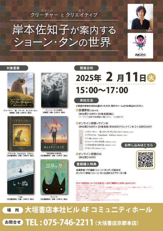 現在大垣書店京都本店 イベントスペース・催にて株式会社求龍堂主催でショーン・タン初画集『クリーチャー 絵、スケッチ、そしてエッセイ』(求龍堂)出版記念展を開催しております。それに際し、翻訳者岸本佐知子さんをお迎えしてショーン・タンの世界、魅力についてお話を伺います。