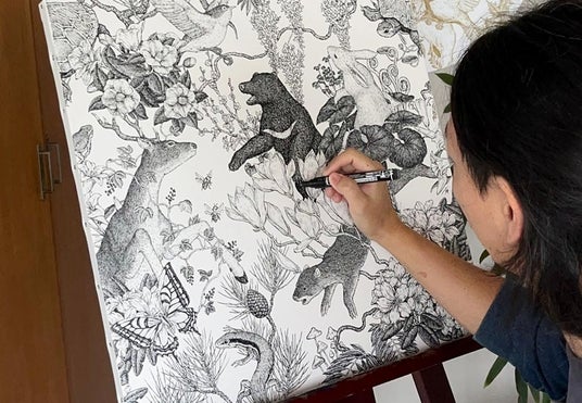 「調和・交わり」をテーマに、モノクロのペンによる細かな描き込みで動植物の群像を表現する、村山大明。日本の森に住む生き物たちが自由に交わり合う世界が細密に表現されています。