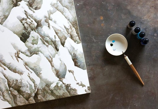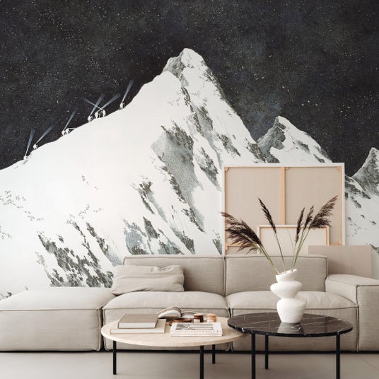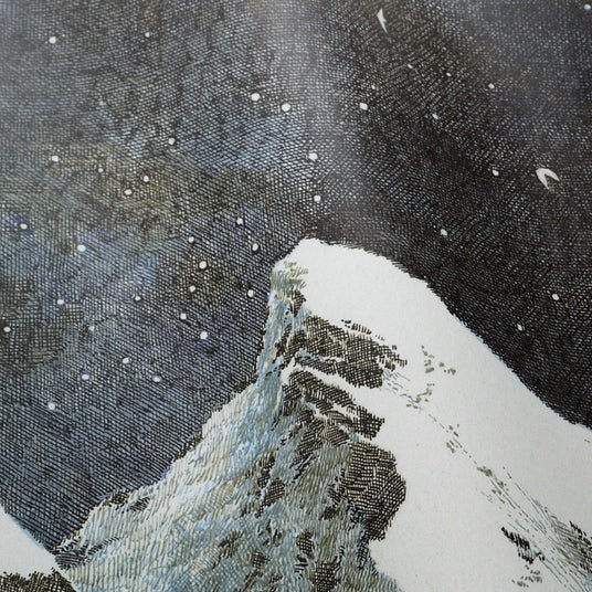 紙に丸ペン、カラーインクを使った緻密な線の集合体でダイナミックな景色を描くイラストレーター・あらきかずま。深い藍色の夜を背景に白く輝く雪山、山頂を目指す登山家たちの描写が引き立つ作品です。
