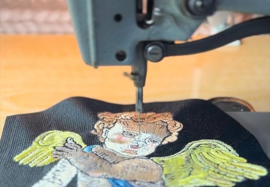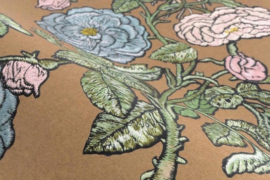 針を横に振るミシン、いわゆる横振りミシンを使いハンドメイドの刺繍作品を制作する作家ma.macaronの作品をデザインに落とし込んだ壁紙。壁紙の表面はフラットですが、刺繍作品のリアルな立体感が表現されています。