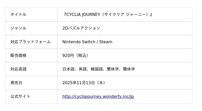 - Steamストアページ: https://store.steampowered.com/app/3949920/CYCLIA_JOURNEY