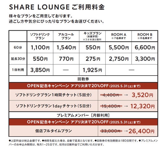<福岡天神 蔦屋書店 SHARE LOUNGE 料金表>