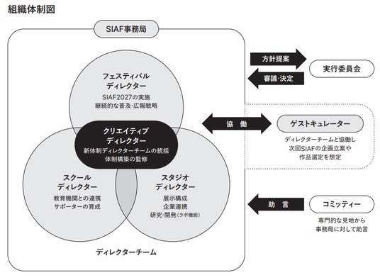 SIAFは3年に一度のフェスティバルですが、開催年以外にも恒常的な取り組みを行っていることが特徴のひとつです。それらの要素を「フェスティバル」「スクール」「スタジオ」という3つの枠組みに整理し、それぞれの部門に、これまでSIAFに長らく関わってきた実務者をディレクターとして選任しました。さらにその体制構築を支えるアドバイザーとして「クリエイティブディレクター」を設置し、前回芸術祭・SIAF2024を牽引した小川秀明氏を選任しました。