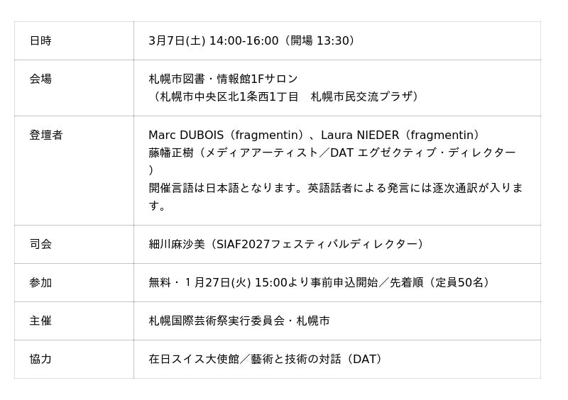 fragmentinからメンバーのMarc DUBOIS(マルク・デュボワ)とLaura NIEDER(ローラ・ニーダー)、DATからエグゼクティブ・ディレクターの藤幡正樹が参加し、モエレ沼公園での展示に向けたオープンディスカッションを行います。